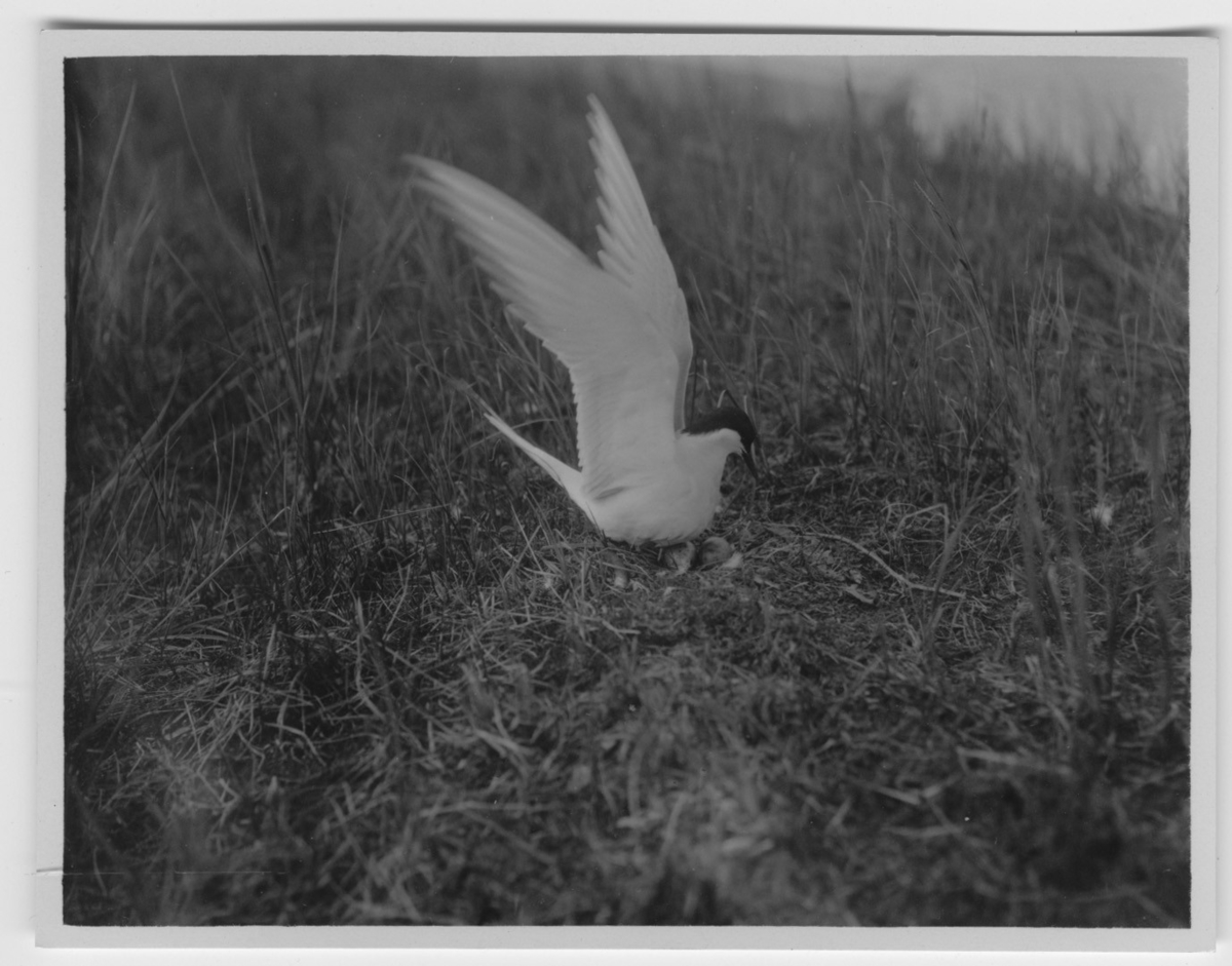 'Slivertärna, landar på boeti gräsvegetation med 2 st ägg. Sedd från sidan. Närbild. :: :: Ingår i serie med fotonr. 2116- 2160.'