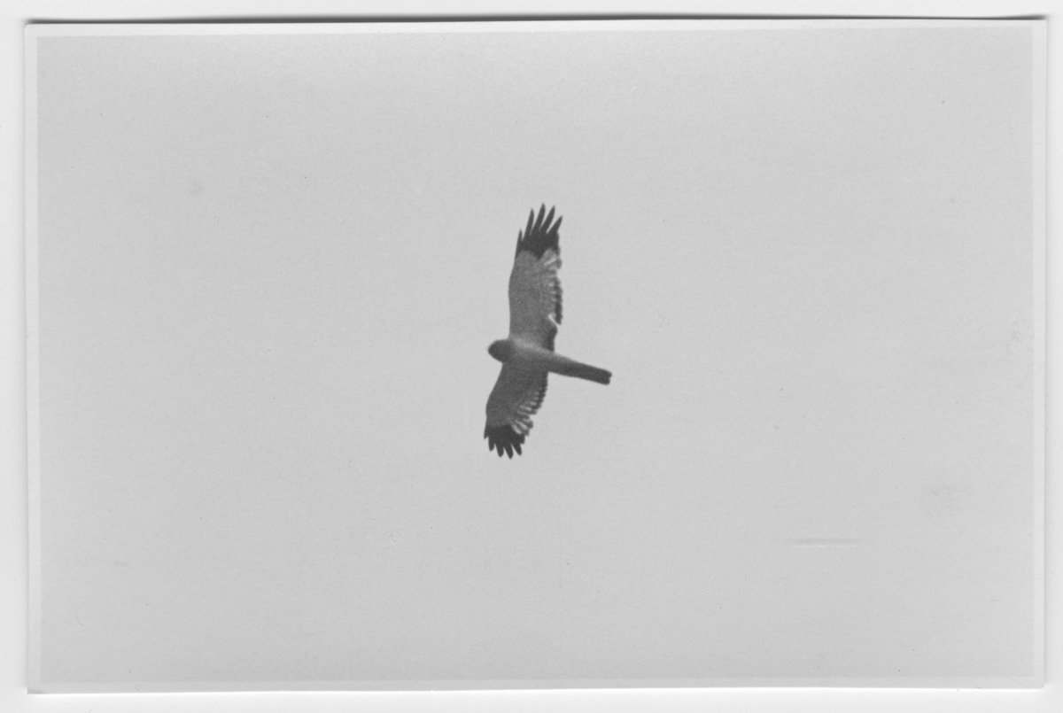 'Blå kärrhök, hane, flygande. Text på baksidan: ''Alla handpennorna ännu i behåll''. :: :: Ingår i serie med fotonr. 2098-2115.'