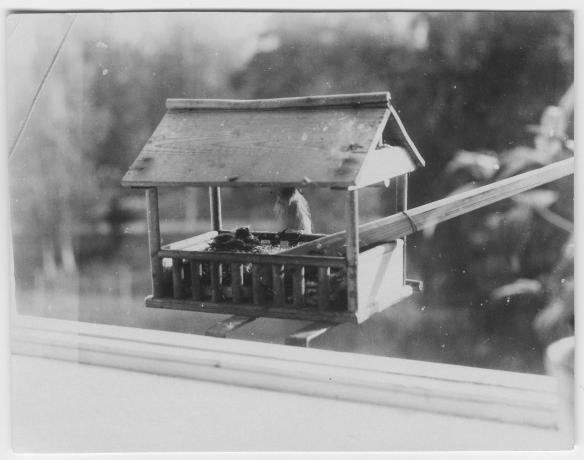 Bo av flugsnappare byggt i fågelbord utanför fönster. Fågel vid boet. Närbild.