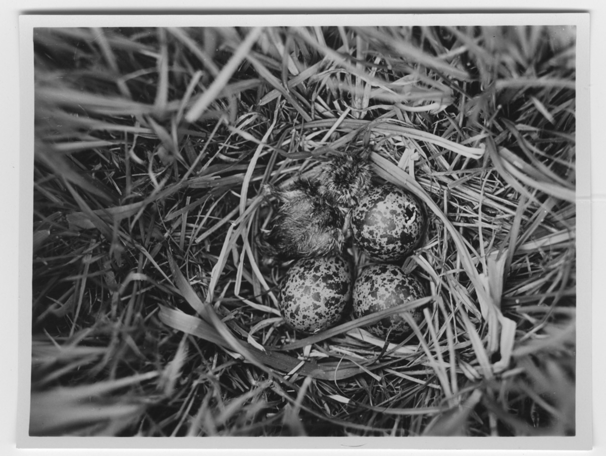 'Bo med 3 st fläckiga ägg och 1 st nykläckt unge av tofsvipa. Närbild. :: Text på baksidan: ''Vipan kläcker.'' :: :: Ingår i serie med fotonr. 2305-2346.'