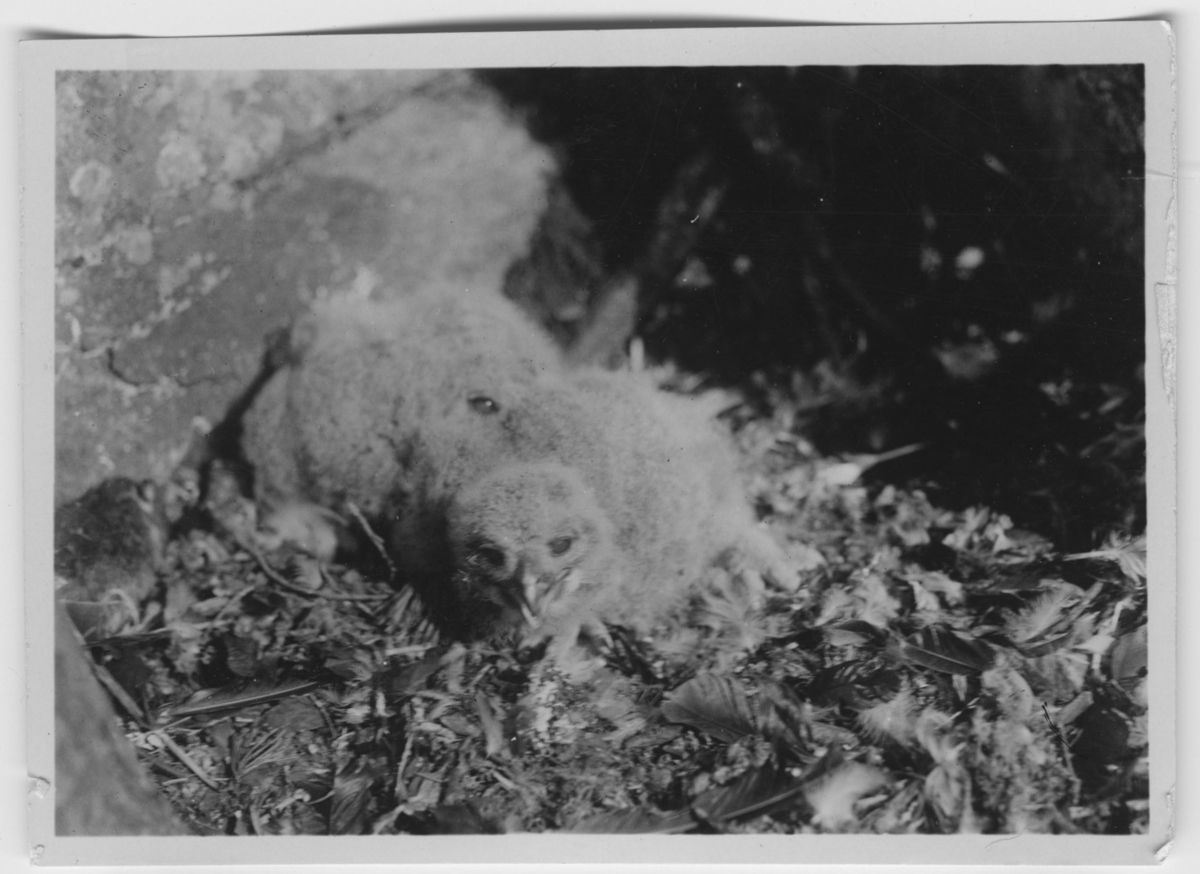 '2 ungar av berguv, i närbild intill berghäll, på marken med fjädrar och torra löv. :: :: Ingår i serie med fotonr. 1771-1837. Se även fotonr. 3151-3200.'