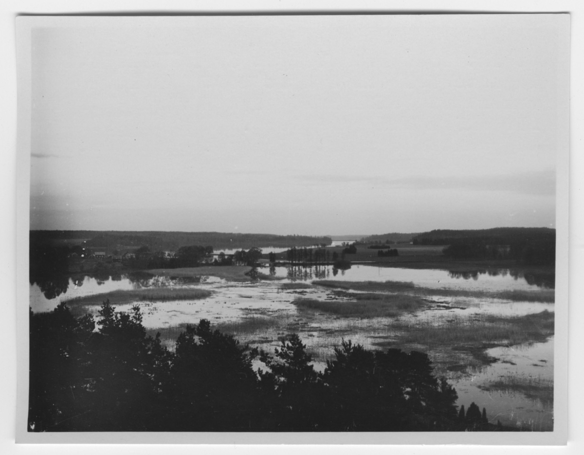 'Utsikt från Kvarnberget över sjöns sydligaste del, vy. Hus på avstånd. Vassruggar i sjön. :: Text på baksidan:'' Utsikt från Kvarnberget över sjöns sydligaste del och längst borta Ekosundsviken. Vassen har som synes varit utsatt för skörd under vintern. Märk det för tidpunkten oerhört höga vattenståndet.'' :: :: Ingår i serie med fotonr. 2305-2346.'