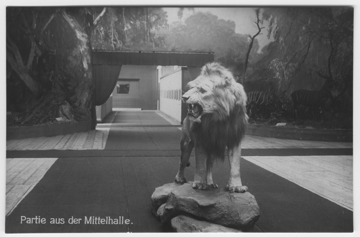 'lejon,hane. Monterad lejonhane i mitthallen. Stora jakt- och fiskeriutställningen 1925 i Düsseldorf. :: ''Parti aus de Mittelhalle'' står på vykortet. På baksidan står ''Grosse jagd- und fischereiausstellung Düsseldorf 1925.'' :: :: Ingår i serie med fotonr. 1975-1997.'