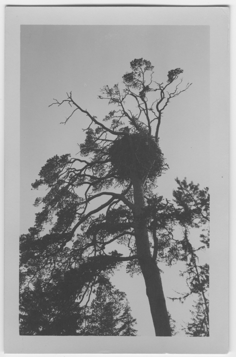'Havsörnbo i tall, 3 st ringmärkta ungar från detta bo skjutna i Sverige, på Öland, via Kalmar och i Dalarna. :: :: Ingår i serie med fotonr. 2262-2265.'