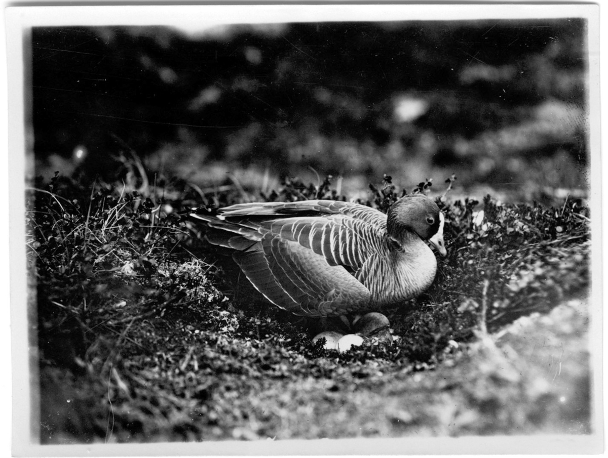 'Ruvande fjällgåshona, äggen under henne synliga. Sedd från sidan, närbild. :: :: Ingår i serie med fotonr. 1690-1708. Se även fotonr. 1413:2, samma motiv.'