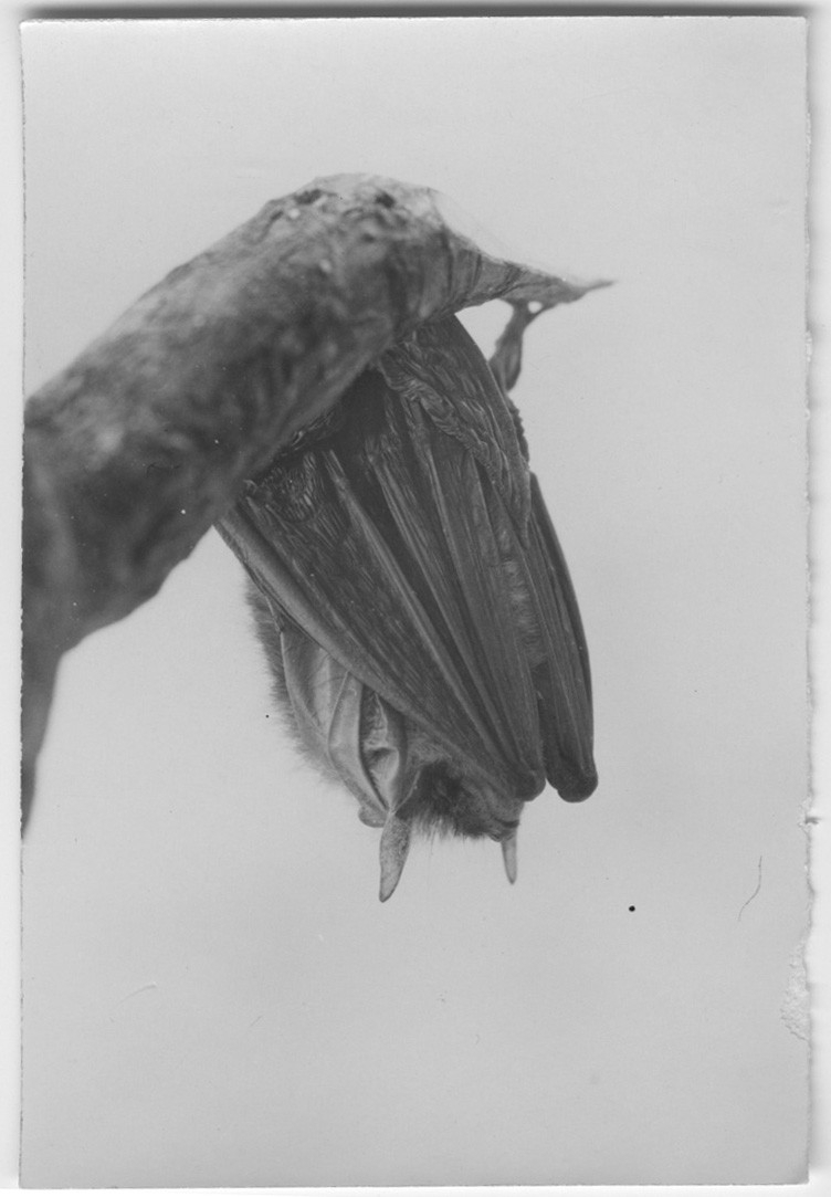 'Långörad fladdermus, hane, hängande, sedd snett framifrån. Närbild. :: :: Ingår i serie med fotonr. 1851-1861.'