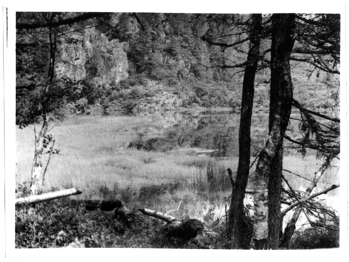 'Ung björk fälld av bäver. Vy med delvis igenväxt vattensamling och barrträd. Oskarp. :: :: Ingår i serie med fotonr. 1738-1749.'