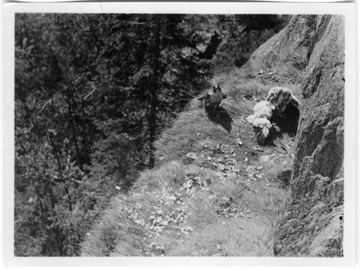 'Enligt bildtext: Pilgrimsfalk med ungar på klipphylla, ungarna kivas om rovet. På klippavsats intill bergvägg. :: :: Ingår i serie med fotonr. 1771-1837. Se även fotonr. 3151-3200.'