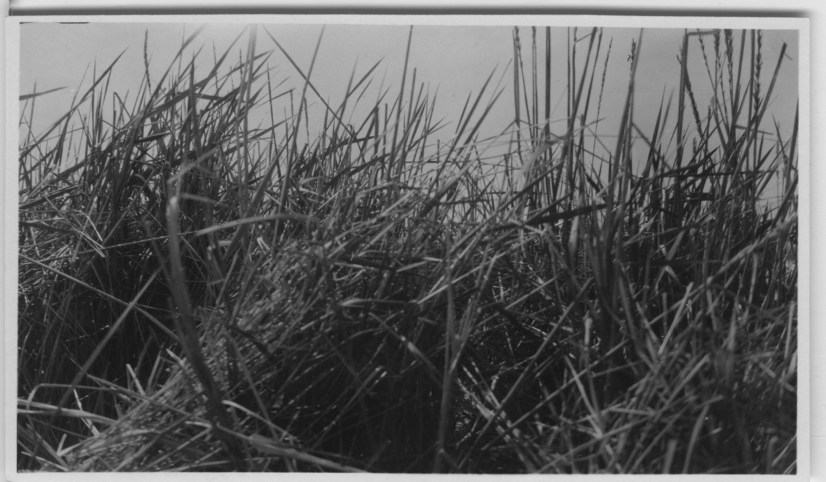 'Göteborgs Biologiska föreningens utfärd till Måkläppen: :: :: Närbild av gräs eller vass med havet i fonden. :: :: Se fotonr. 1384-1395, 1618-1639, 1640-1648 samt 3229 från samma utfärd.'