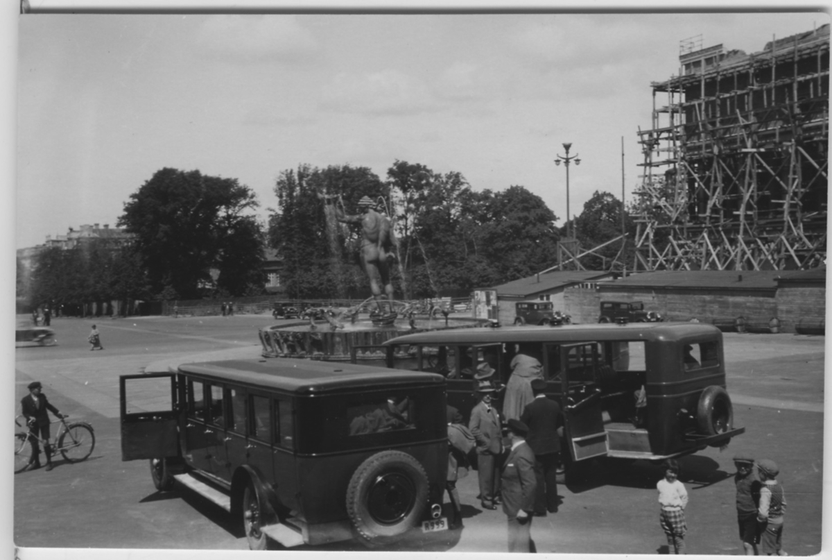 'Biologiska förenings utfärd till Fjärås-Onsala-Nidingen-Malön-Kalvön: :: :: ''Start på Götaplatsen'', 2 st bussar, 5 st män och 3 st barn vid bussarna. 1 st man med cykel till vänster. Poseidonstatyn i bakgrunden. Byggnad med byggnadsställningr till höger. :: :: :: Se fotonr. 2489-2500 och 2501-2515 från samma utfärd.'