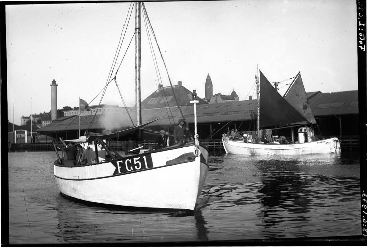 'Kattegatt-expeditionen lämnar Göteborgs fiskhamn, båten ''FC51'' (FG51) i förgrunden.'