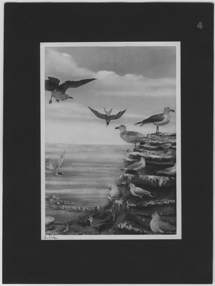 'Sjöstrandens fåglar (måsfåglar). :: :: Bilderna är numrerade 1-6 och det finns ett tillhörande häfte med en text till varje bild: Orr- och Tjädertuppar, Grå häger, Fiskgjuse, Strandfåglar, Mårddjur och Vildsvin. :: :: Ingår i en serie fotonr. 3096-3108 med 12 st fotografier av dioramorna i Zoologiska museet i Berlin och fotonr. 3109-3120 med 12 st fotografier av dioramorna i Hermann-Roemer-museet, Hildesheim.'