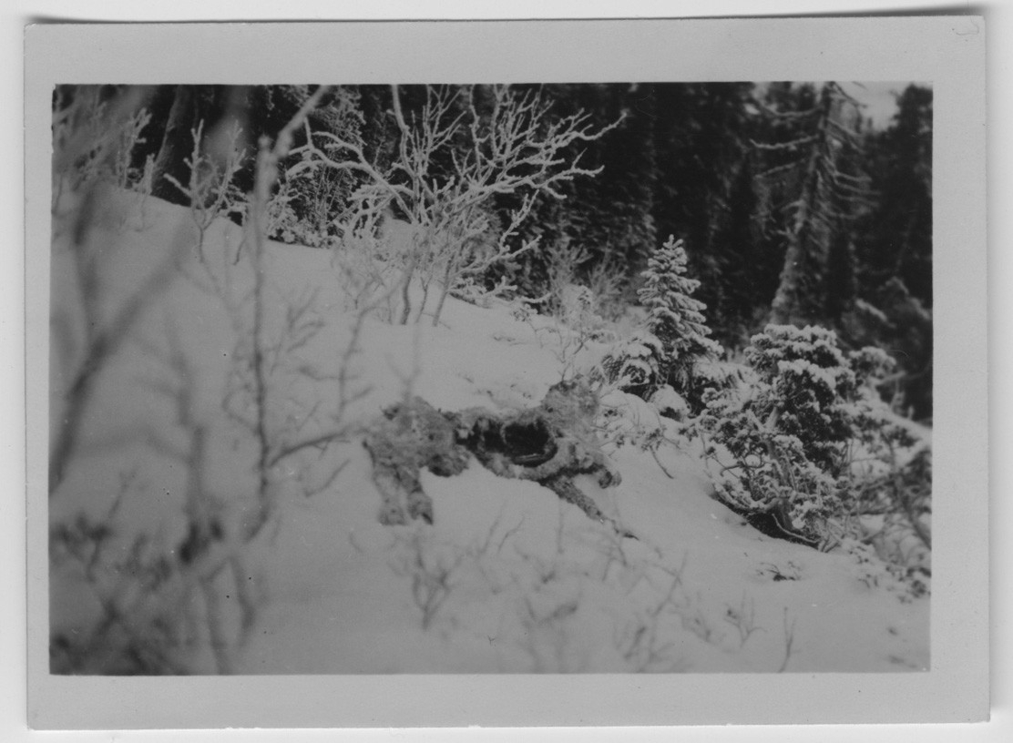 'Ren riven av varg, liggande i snöklädd sluttning med smågranar. På avstånd. Vinterlandskap. :: :: Se även fotonr. 3223:1-2.'