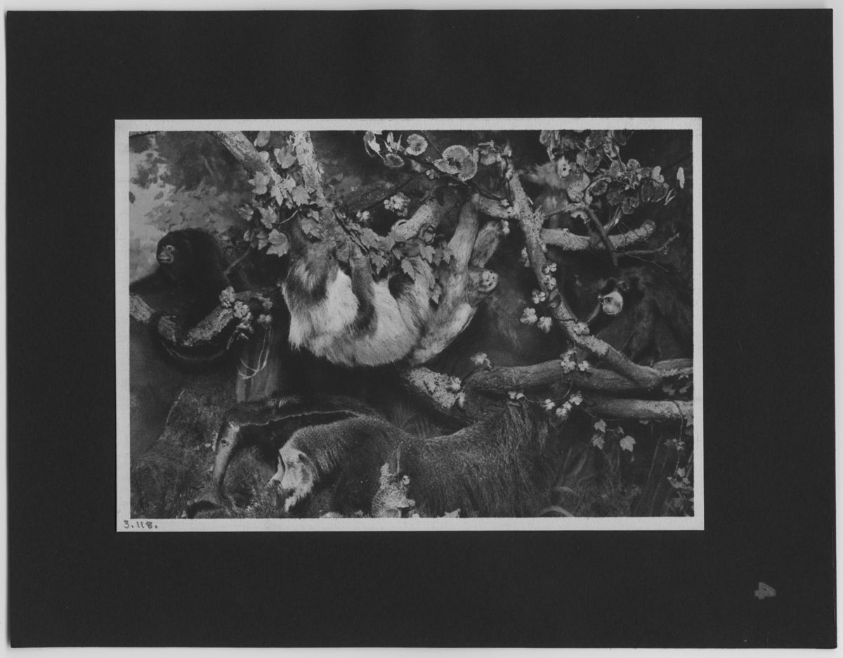 'Sydamerikansk urskog med monterade djur, apa m.fl. :: :: Bilderna är numrerade 1-6 och det finns ett tillhörande häfte med en text till varje bild: Afrikanska strutsar, Krokodiler, Gördeldjur, Sydamerikansk urskog, Apor från Sundaöarna samt Isbjörnar. :: :: Ingår i en serie fotonr. 3096-3108 med 12 st fotografier av dioramorna i Zoologiska museet i Berlin och fotonr. 3109-3120 med 12 st fotografier av dioramorna i Hermann-Roemer-museet, Hildesheim.'