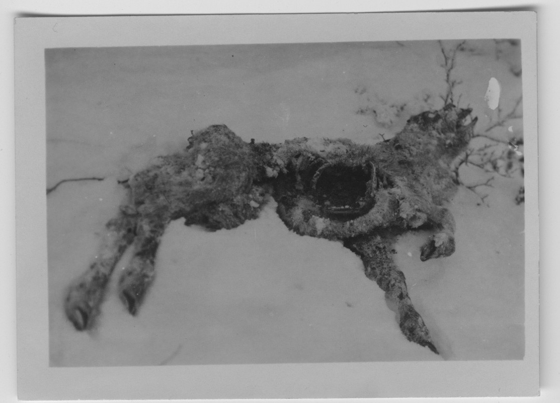 'Ren riven av varg, liggande i snön i skogen. Närbild. :: :: Se även fotonr. 3223:1-2.'