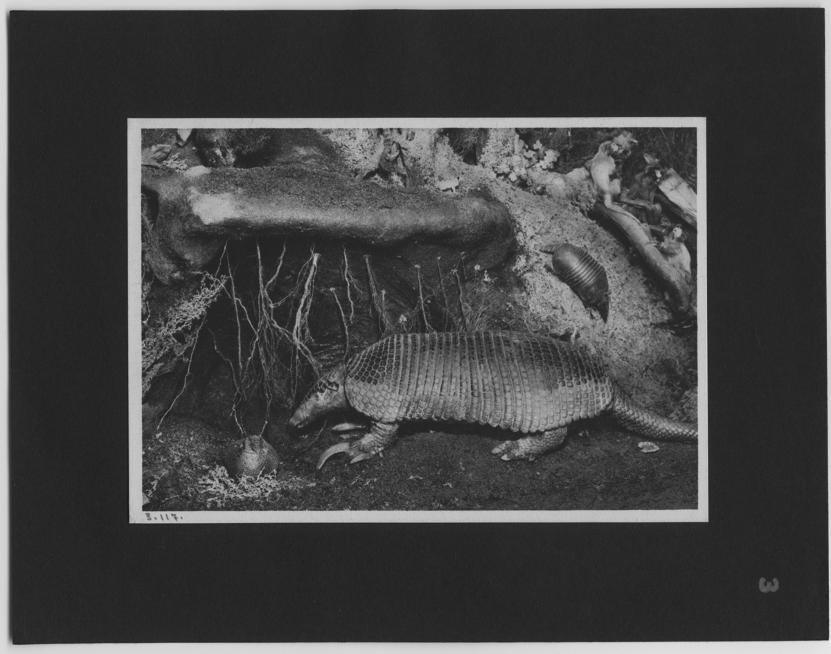 'Sydamerikanska gördeldjur, 1 adult (och 2 ungar). :: :: Bilderna är numrerade 1-6 och det finns ett tillhörande häfte med en text till varje bild: Afrikanska strutsar, Krokodiler, Gördeldjur, Sydamerikansk urskog, Apor från Sundaöarna samt Isbjörnar. :: :: Ingår i en serie fotonr. 3096-3108 med 12 st fotografier av dioramorna i Zoologiska museet i Berlin och fotonr. 3109-3120 med 12 st fotografier av dioramorna i Hermann-Roemer-museet, Hildesheim.'