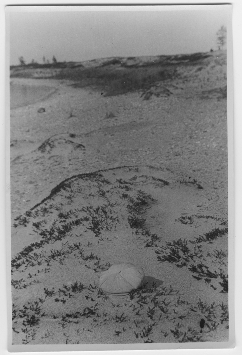 Häckningsplats för mosnäppa. Vy över strand. Keps liggande i förgrunden i sanden.