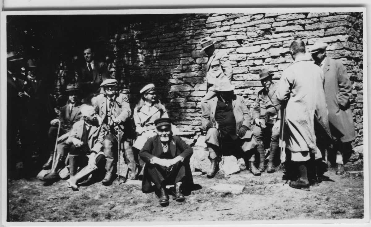 'Biologiska föreningens utfärd till Öland: :: :: Text enligt fotot: ''Vilostund vid Petgärde.'' Ca 12st män samlade framför en stenvägg. Leonard Axel Jägerskiöld, andre sittande från vänster. :: :: Se även fotonr. 2607-2625, 2583-2606 samt 2883-2911 från samma utfärd.'