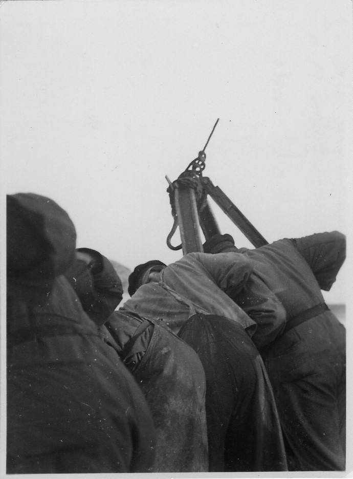'Skandiaexpeditionen 1935: :: :: 4 personer på däck, lutade över relingen, enligt anteckning på baksidan av fotografiet: ''i spänd förväntan på vad skrapan skall innehålla''. Samma motiv som fotonr. 3487. :: :: Ingår i serie med fotonr. 3441-3452.'