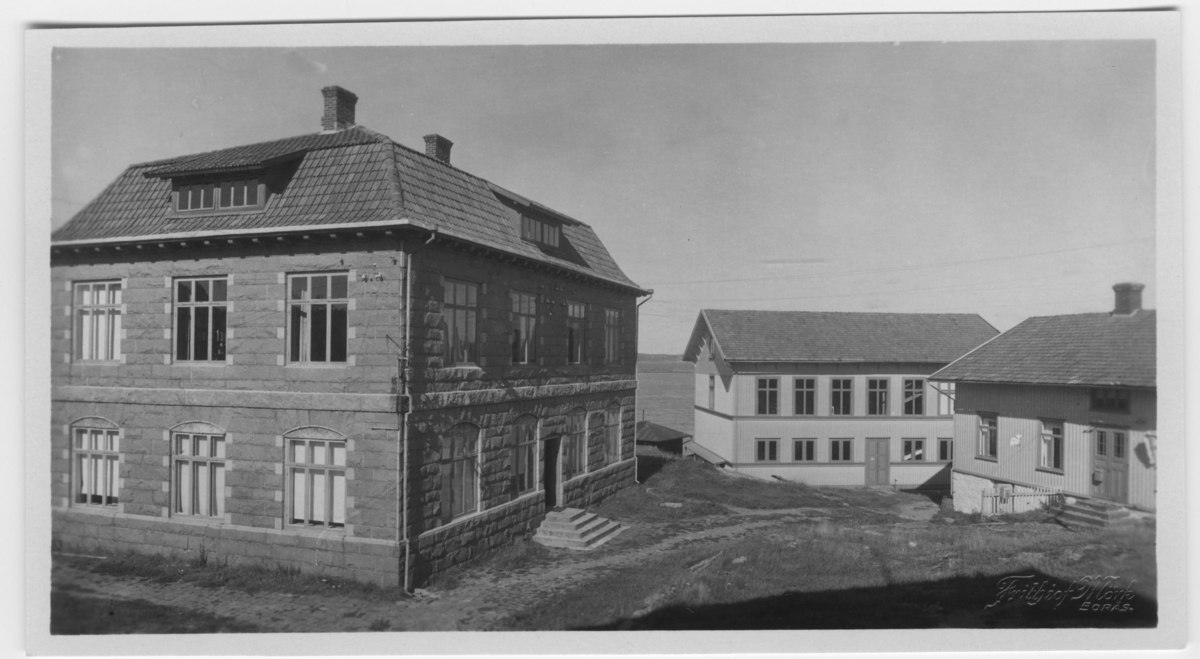 'Kristinebergs station sedd från vattentornet. 1 st stenbyggnad med trappa och 2 st träbyggnader. Vy mot havet i fonden. :: :: Ingår i serie med fotonr. 2876-2882.'