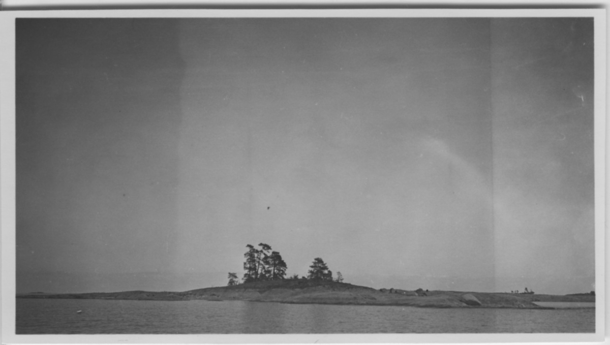 'Biologiska föreningens utfärd till Läckö och Ekens skärgård: :: :: Fiskgjusebo i tall. Vy över ö med tallträd, från sjön. :: :: Se fotonr. 3242-3254, 3255, 3256-3259, 3260-3285 samt 3889-3894.'