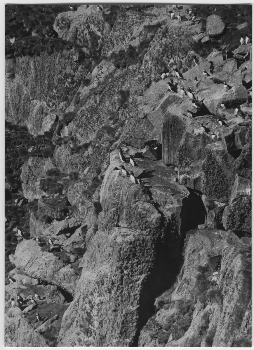 'Vy över klippa med tordmular och lunnefåglar på klippavsatser. :: :: Ingår i serie med fotonr. 3382-3407.'