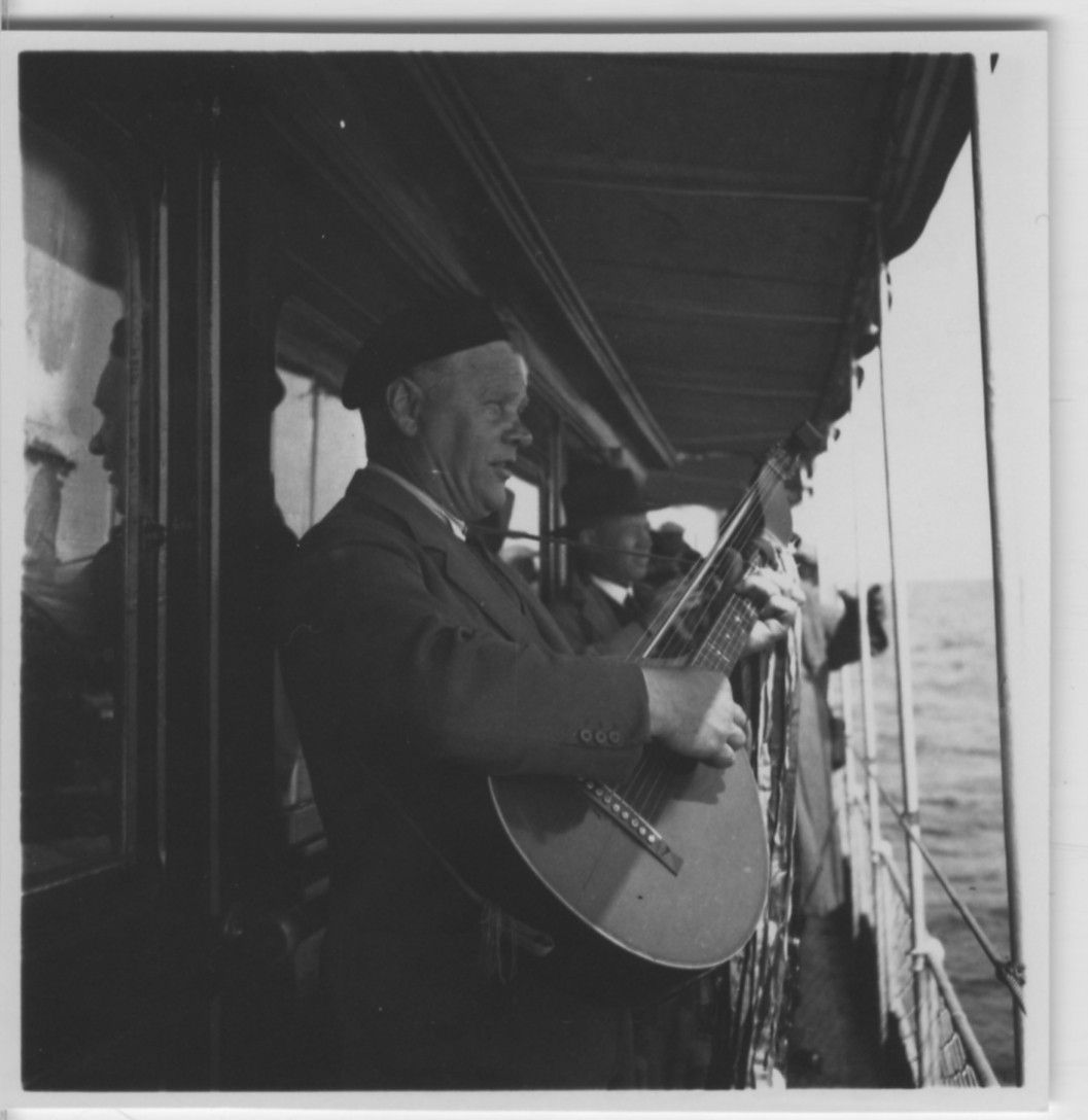 'Biologiska föreningens utfärd till Läsö och Nordre Rönner: :: :: Arkitekt C.O. Svensson på ''BRIS'', spelar stränginstrument vid relingen. Fler män i bakgrunden på båtens däck. Iklädda mössa. :: :: Se fotonr. 2674-2734, 2687-2691, 2692-2711, 2714-2734, 2843-2863 och 2975 från samma utfärd.'
