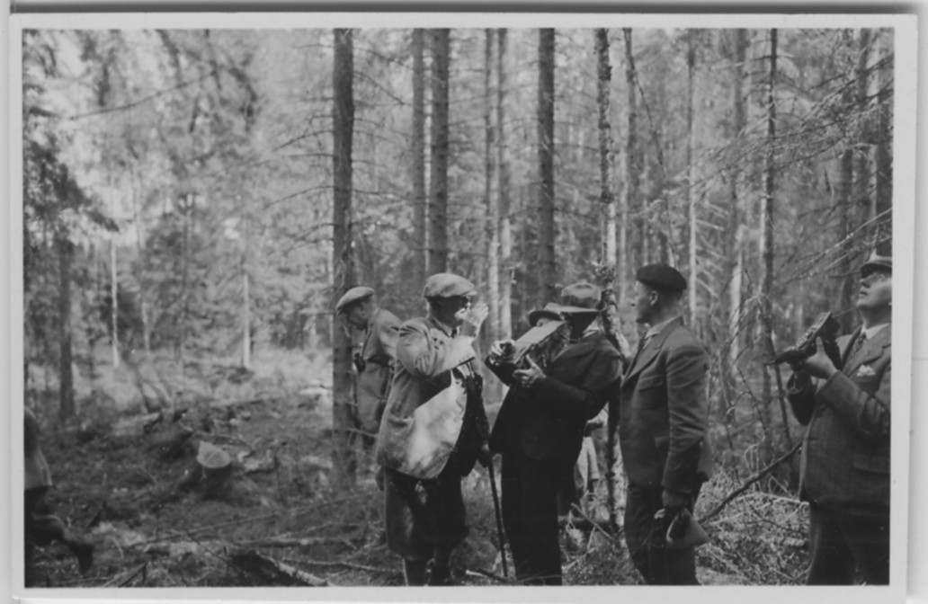 'Biologiska föreningens utfärd till Läckö och Stora Ekens skärgård: :: :: 6 män vid fiskgjuseboet på Stora Eken. 2 av männen fotograferar upp mot boet. I granskog. :: :: Se fotonr. 3242-3254, 3255, 3256-3259, 3260-3285 samt 3889-3894.'