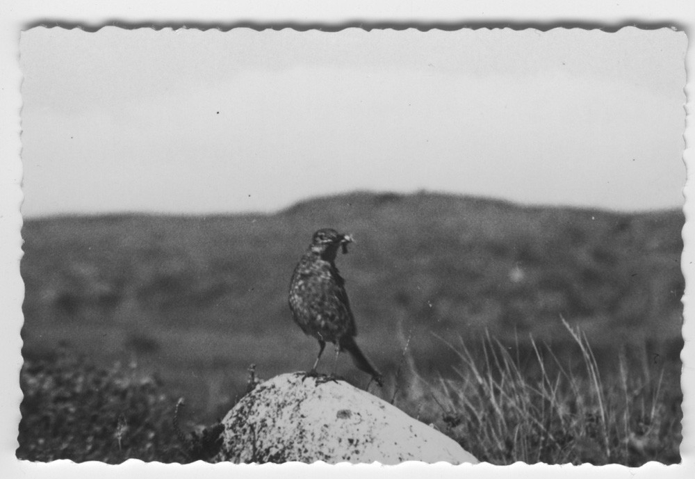 'Enligt fototext: Gökungens fostermor, 1 skärpiplärka, med föda i näbben. Sittande på stenblock. Se även fotonr 3655. :: :: Se serie med fotonr. 3650-3660.'