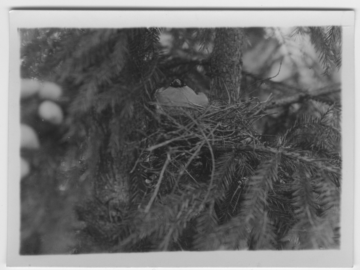 'Domherrebo med ruvande hona, sedd framifrån. I gran. Text på baksidan: ''Domherrehona, ruvande i boet.'' :: :: Ingår i serie med fotonr. 4102-4109.'