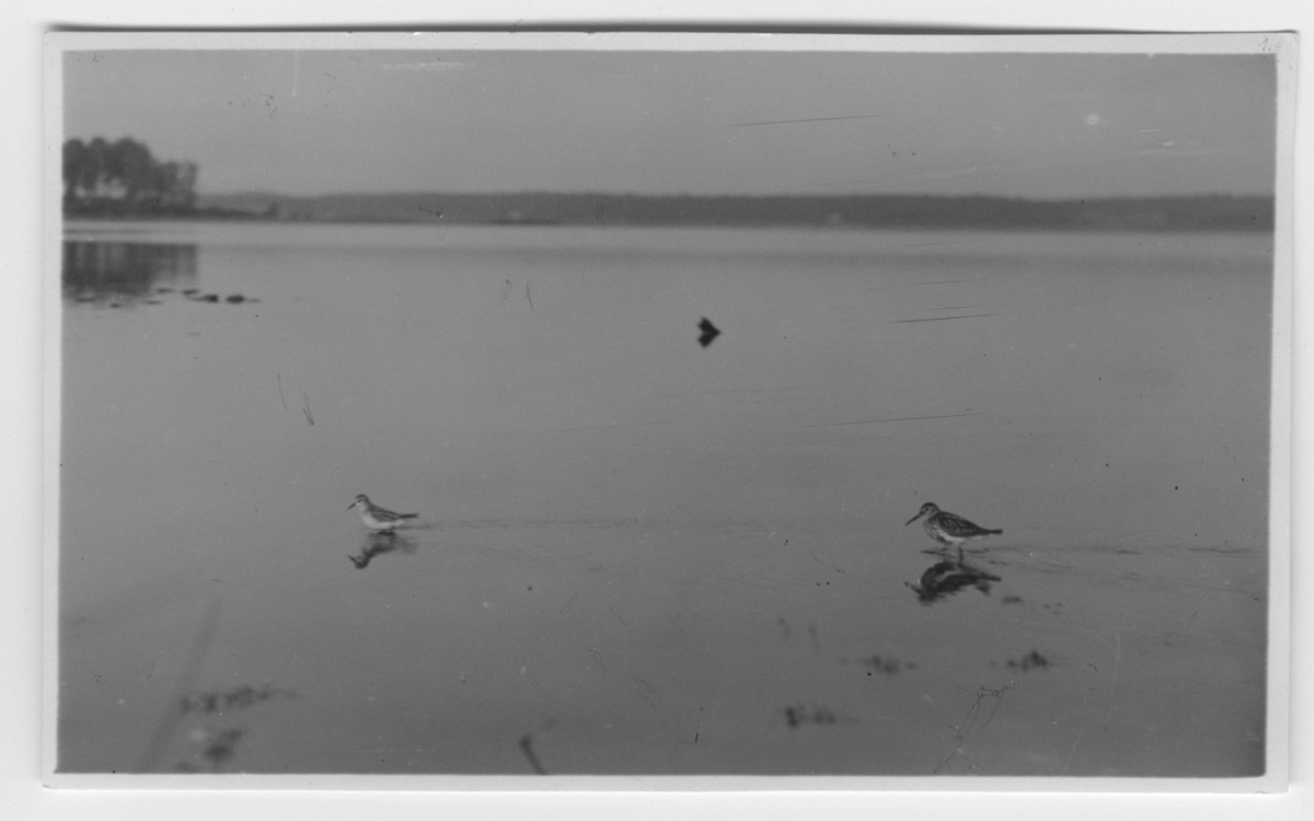 '1 kärrsnäppa och 1 småsnäppa, vadande. Vy med vatten och träridå på avstånd. :: :: Ingår i serie med fotonr. 3495-3511.'