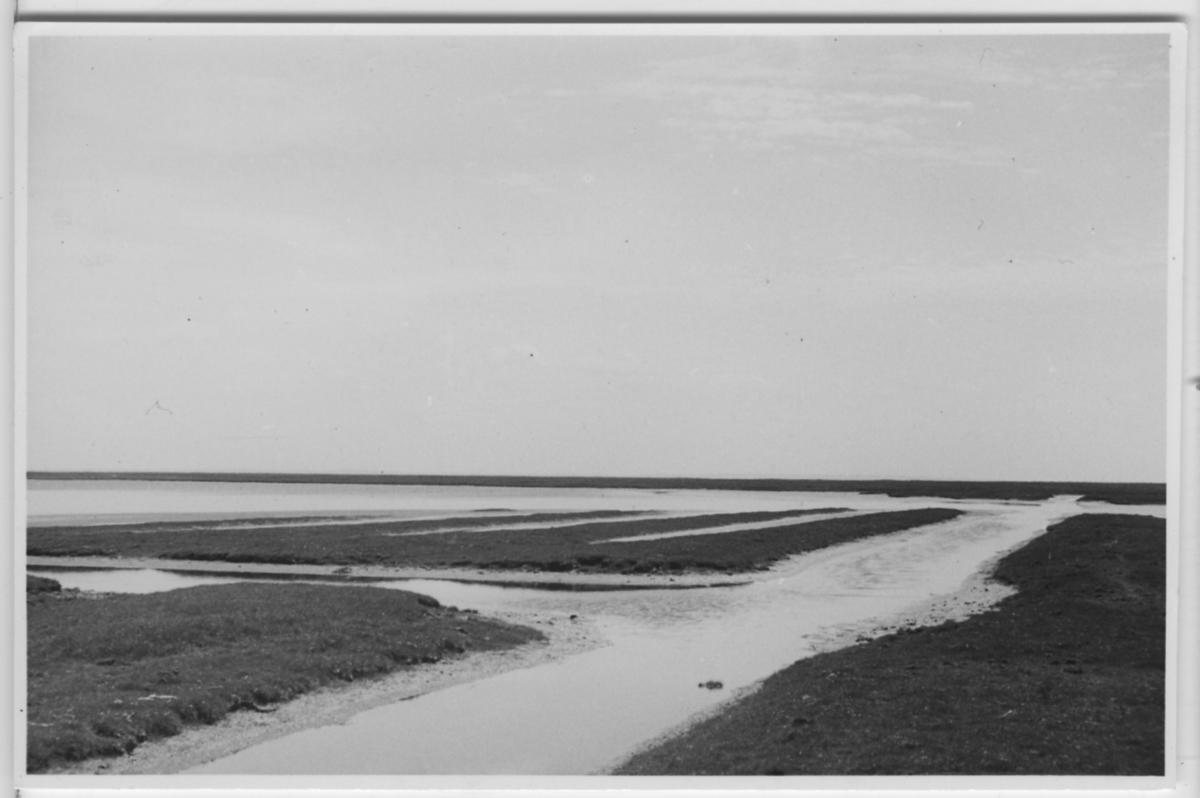 'Biologiska föreningens utfärd till Nordjylland: :: :: Vejlerne, vy över vattendrag och våtmark. :: :: Ingår i serie med fotonr. 3824-3859.'