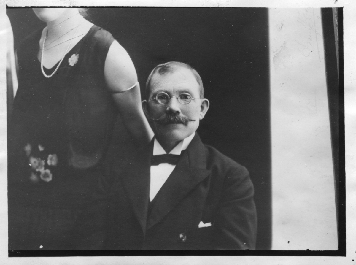 'Vakten, Göteborgs Naturhistoriska Museum Kristian Berntsson, 1868-01-31-1934-06-21, vakt på museet sedan februari 1899. '' Avfotografering''. Närbild. Kvinna delvis synlig i bakgrunden. :: :: Bilden använd i Göteborgs Naturhistoriska Museums Årstryck 1936 s. 24 till minne av Kristian Berntsson.'