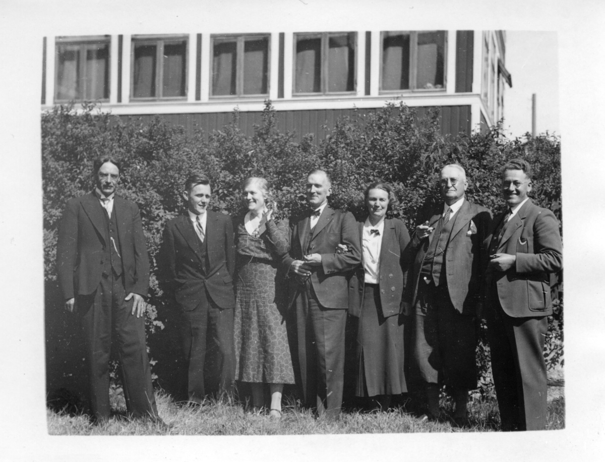 'Gruppbild tagen utanför Biologiska statationen, Trondheim, 7 personer varav 2 kvinnor och 5 män stående framför husvägg av trä, nedanför fönster. Från vänster till höger: Nils Odhner, ?, ?, ?, ?, Leonard Axel Jägerskiöld och längst till höger Sune Swärd. Enligt bildtext: ''Avresedagen''. :: :: Ingår i serie med fotonr. 3679-3693 se även 3694-3719.'
