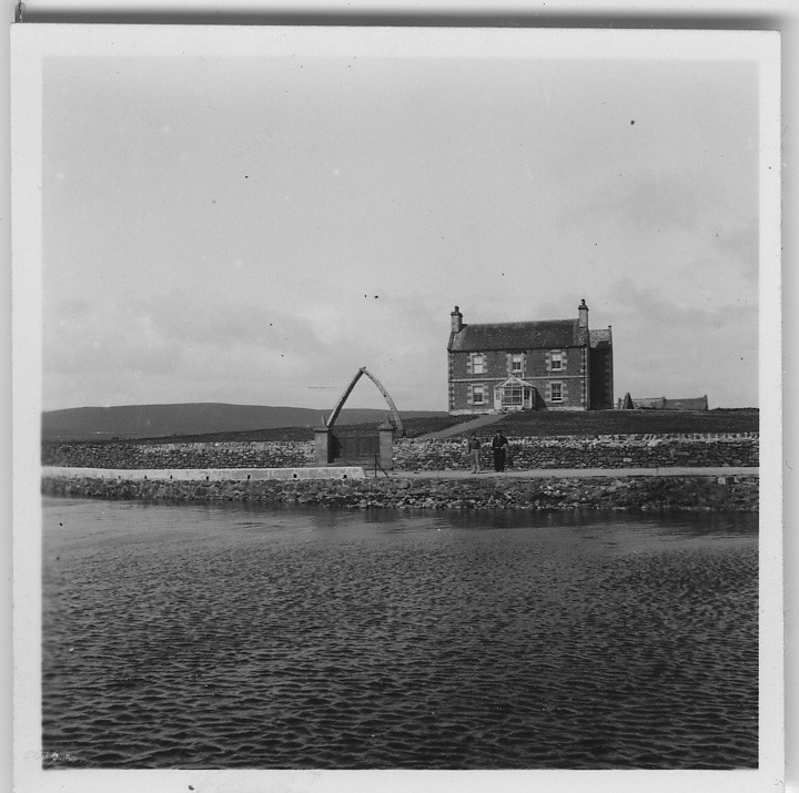 'Från ''Skageraks''-expeditionen till Hebriderna och Shetland: :: :: 2 (män) människor nedanför hotellet i Balta sound. Hotellet är en stenbyggnad med glasveranda, framför byggnaden finns en stenmur med port och gångväg till hotellet (förstorad version av foto nr 4113:69). :: :: Ingår i serie med fotonr. 4113:1-82.'