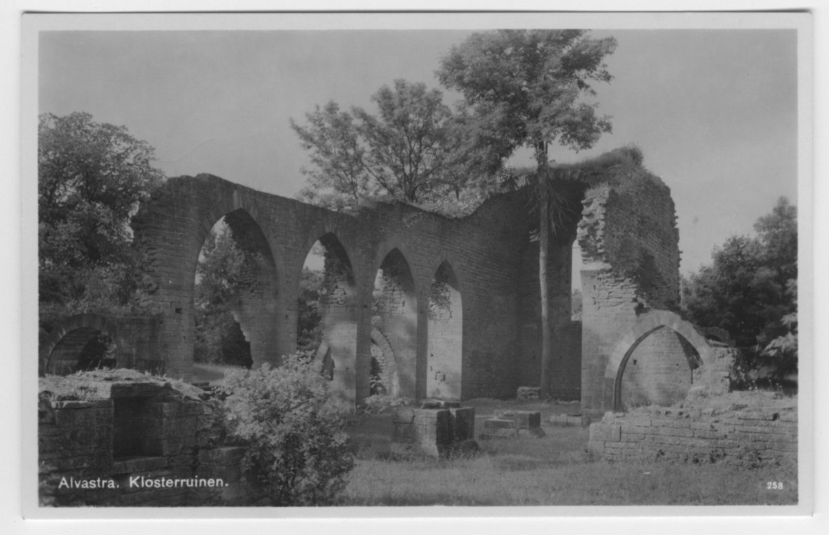 'Del av Alvastra klosterruin. Med träd växande i ruinen. :: :: Ingår i serie med fotonr. 3642-3645.'