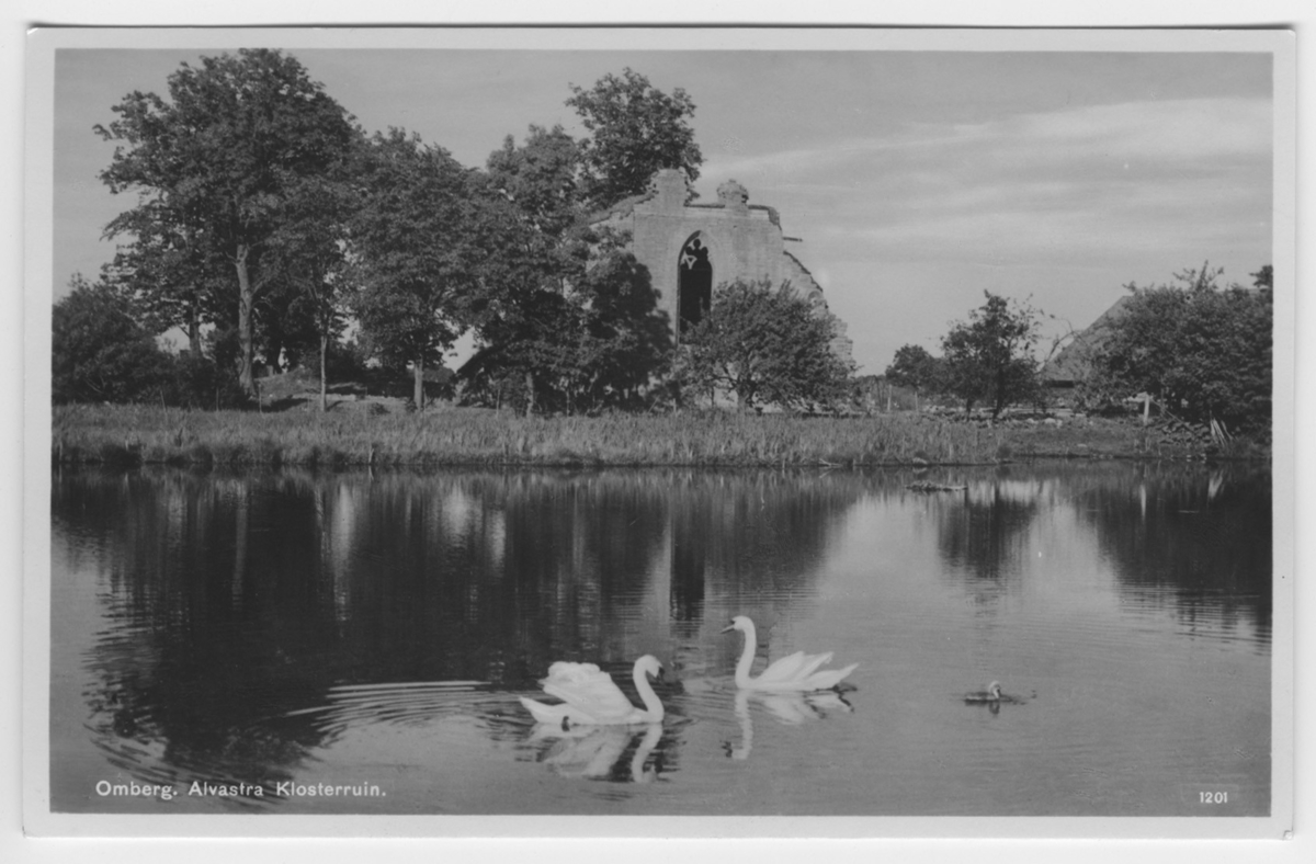 'Omberg. Alvastra klosterruin. Vy från sjön mot slottsruinen, 2 simmande svanar i förgrunden. :: :: Ingår i serie med fotonr. 3642-3645.'