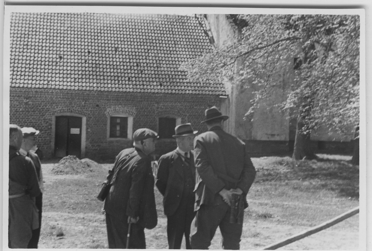 'Från Biologiska Föreningens utfärd till Ivö m. fl. platser i NÖ Skån: :: :: 5 män framför byggnad: Bäckaskog slott. Leonard Axel Jägerskiöld med käpp. Hatt. Hörapparat. Kikare. :: :: Se fotonr. 4119:1-11 och 4120:1-10 från samma utfärd. Fotonr.'