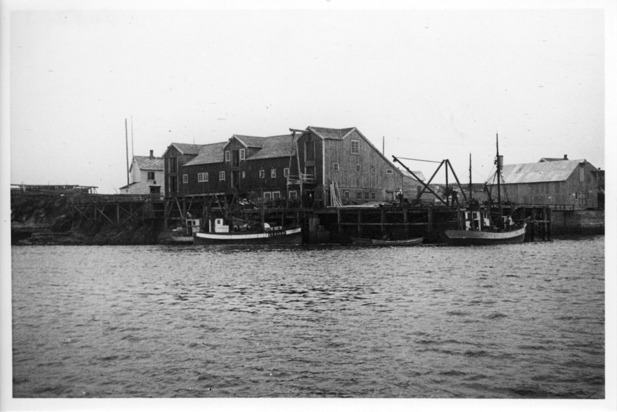'Kaj med 2 fiskbåtar och 1 eka, byggnader i trä, fotograferad från vattnet. Några personer stående på kaj. :: :: Ingår i serie med fotonr. 3679-3693 se även 3694-3719.'