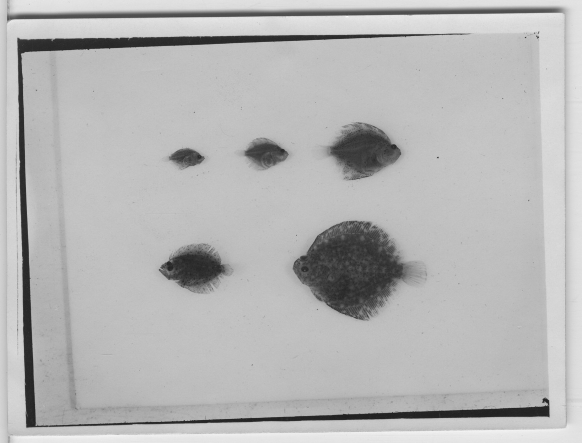'En serie ungdomsstadier hos slätvar visande ögats ''vandring''. 5 fiskar'