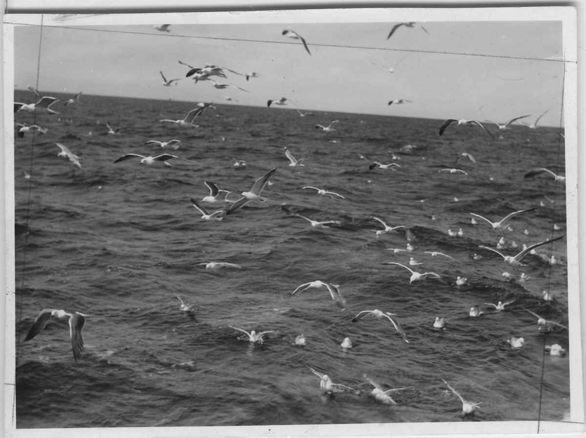 '''Skageraks''expedition 6-10 juni 1939: :: :: Fågelmoln över vatten. På baksidan står ''är ej denna bäst. HT 3n. Stormfåglar och ett par måsar följa Skagerak'' Rektangel i blyerts utritad på fotot. Står på baksidan ''14.4 vinkla, 71 grader F, 617/7''. :: :: Ingår i serie 4101:1-8.'