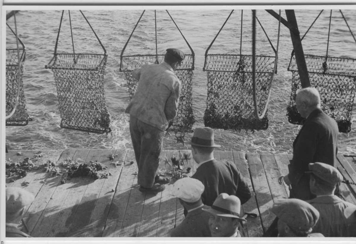 'Biologiska föreningens utfärd till Nordjylland: :: :: Ostronskrapningar i Limfjorden, 1 man i färd med att tömma en skrapa. 6 män tittar på, en med ansiktet vänt mot kameran. :: :: Ingår i serie med fotonr. 3824-3859.'