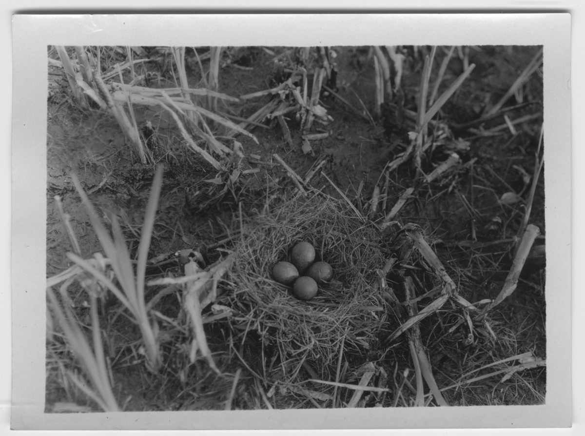 'Tofsvipa, bo med 4 ägg. Text på baksidan: ''Bo av vipa, byggt ute på våta dyn i Hornborgasjöns vass. Förändrad form...'' :: :: Ingår i serie med fotonr. 4102-4109.'