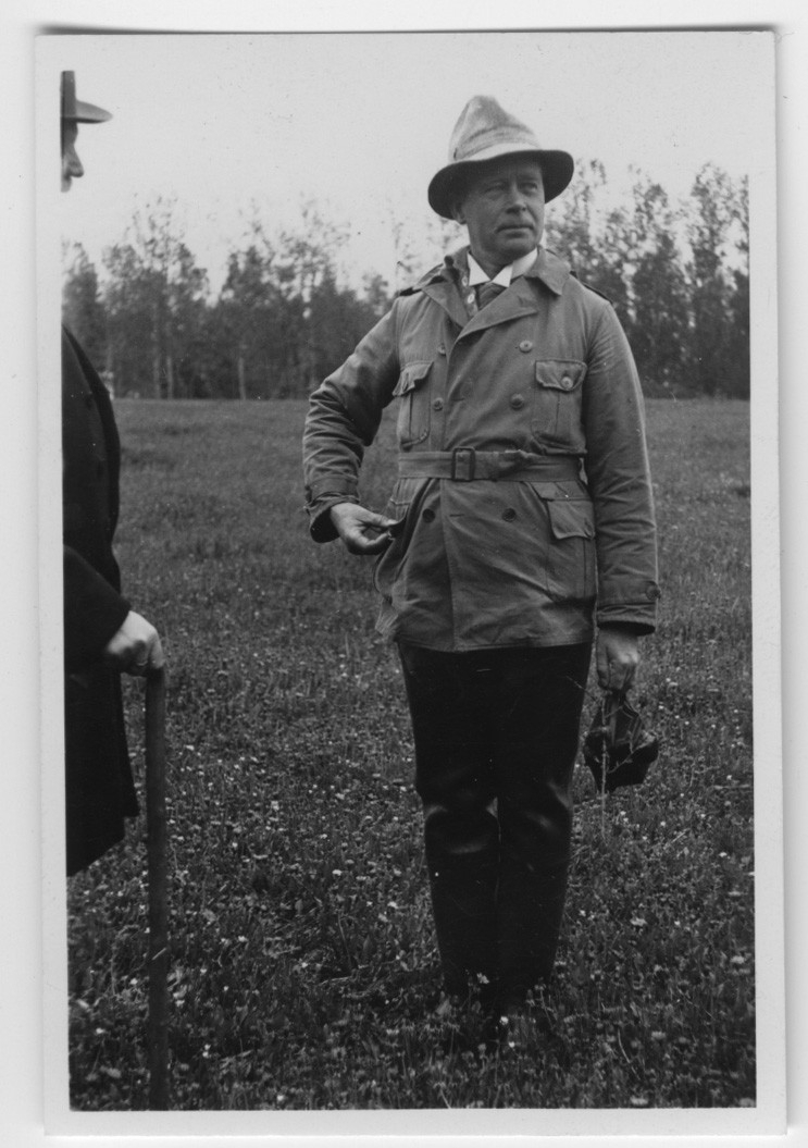 Läroverksadjunkten Folke Persson, Karlstad, i helbild. I fonden öppet fält och skog på avstånd. Invid Folke står ytterligare 1 person delvis synlig.