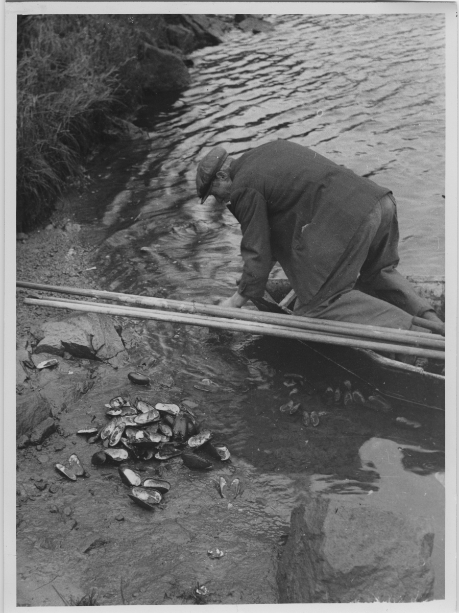 '1 man i eka intill strandkanten, plockar musslor. Hög med musselskal liggande på stranden. :: Enligt bildtext: Pärlfiske i Lagan: musslor som levat förgäves ur pärlfiskaresynpunkt. :: :: Ingår i serie med fotonr. 3744-3750.'