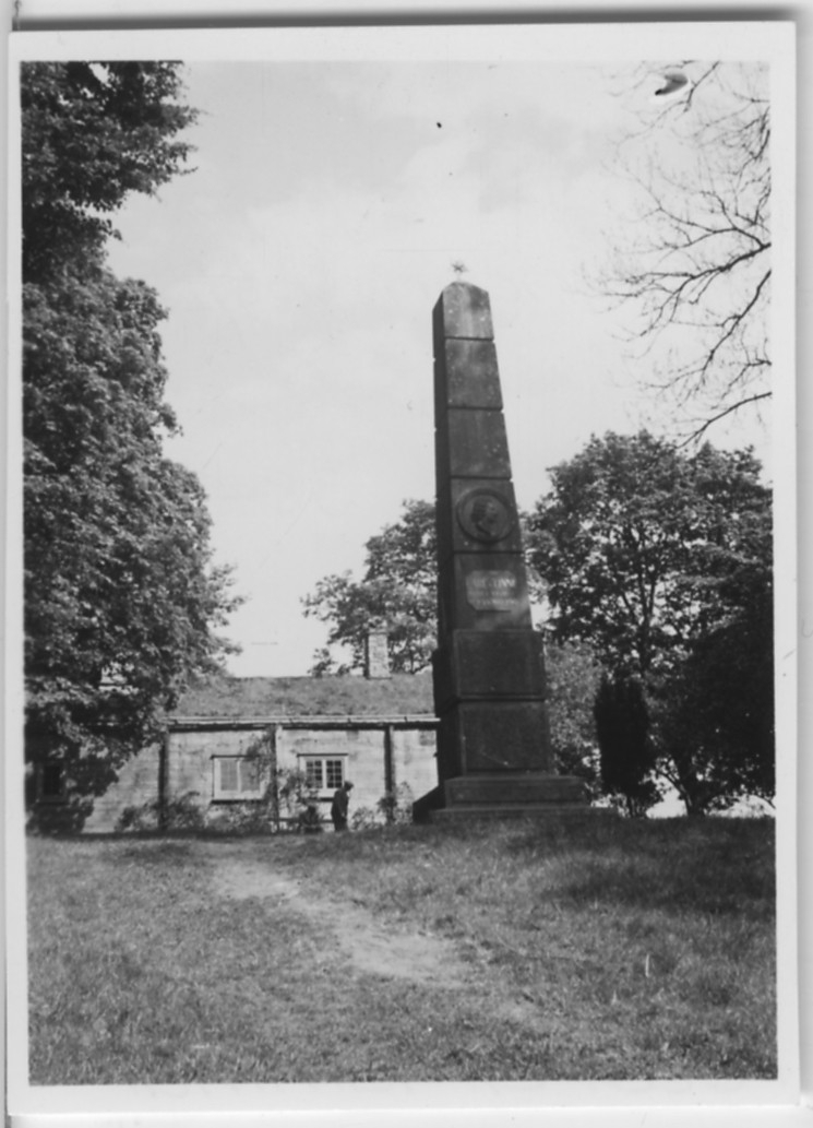 'Biologiska föreningens utfärd till Växjö, Aneboda och Misterhult: :: :: Minnessten vid Linnés födelsehem. I bakgrunden hus samt en man. :: :: Se 3902-3908, 3909-3923 samt 3924-3933 från samma utfärd.'