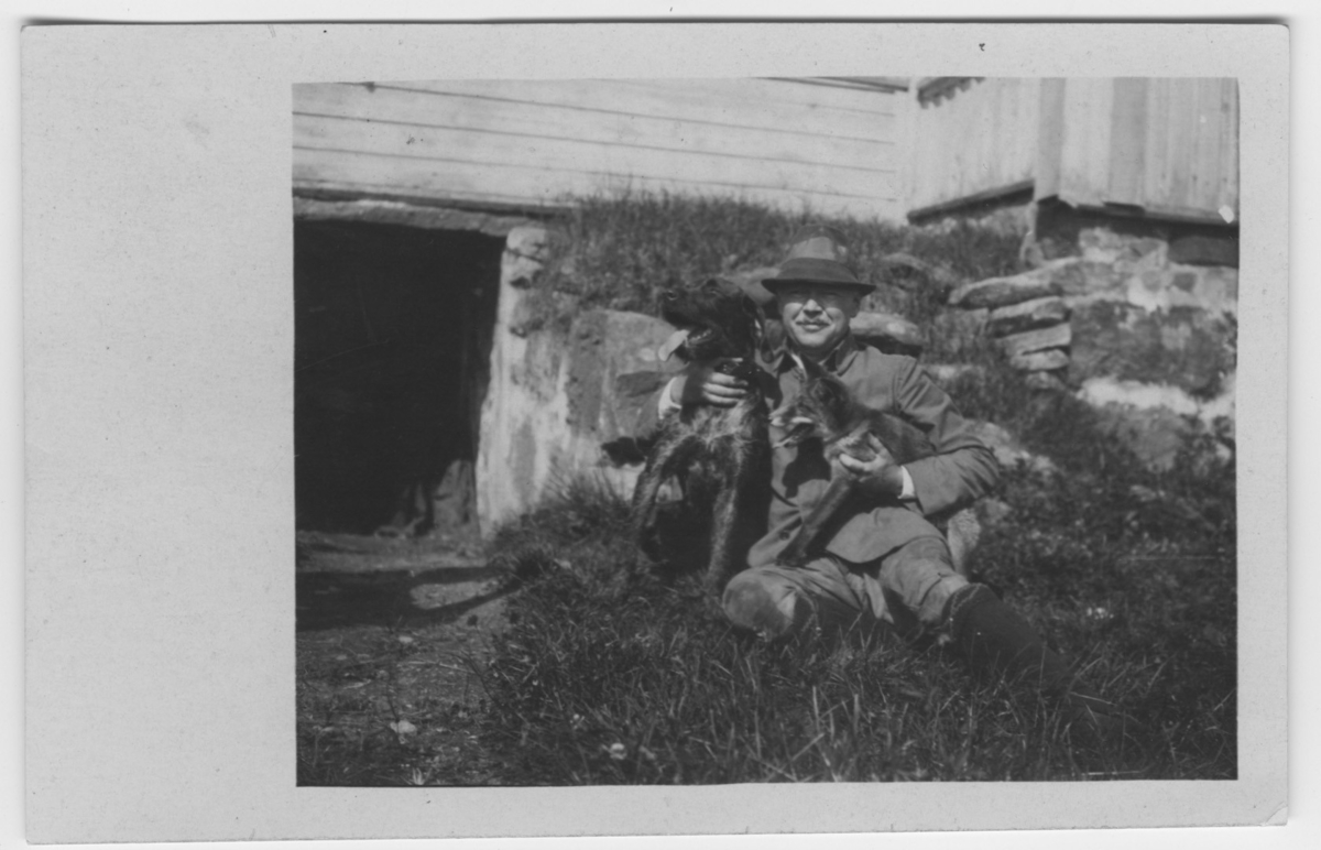 'Graf Otto Zedlitz, sittande i gräset med 1 hund och ev. 1 räv i famnen. :: :: Text på vykortet:'' To..n..? 1925-12-31. Herr Professor! Jag ber få tacka för Edert vackert vykort från Slottsskogsmuseet samt vänliga hälsningar. Jag frambär mina hjärtliga önskningar för ett Gott Nytt År för Professorn samt hela hans familjer! Jag hoppas få komma dit rätt så snart. Eder tillgivne O. Zedlitz.'