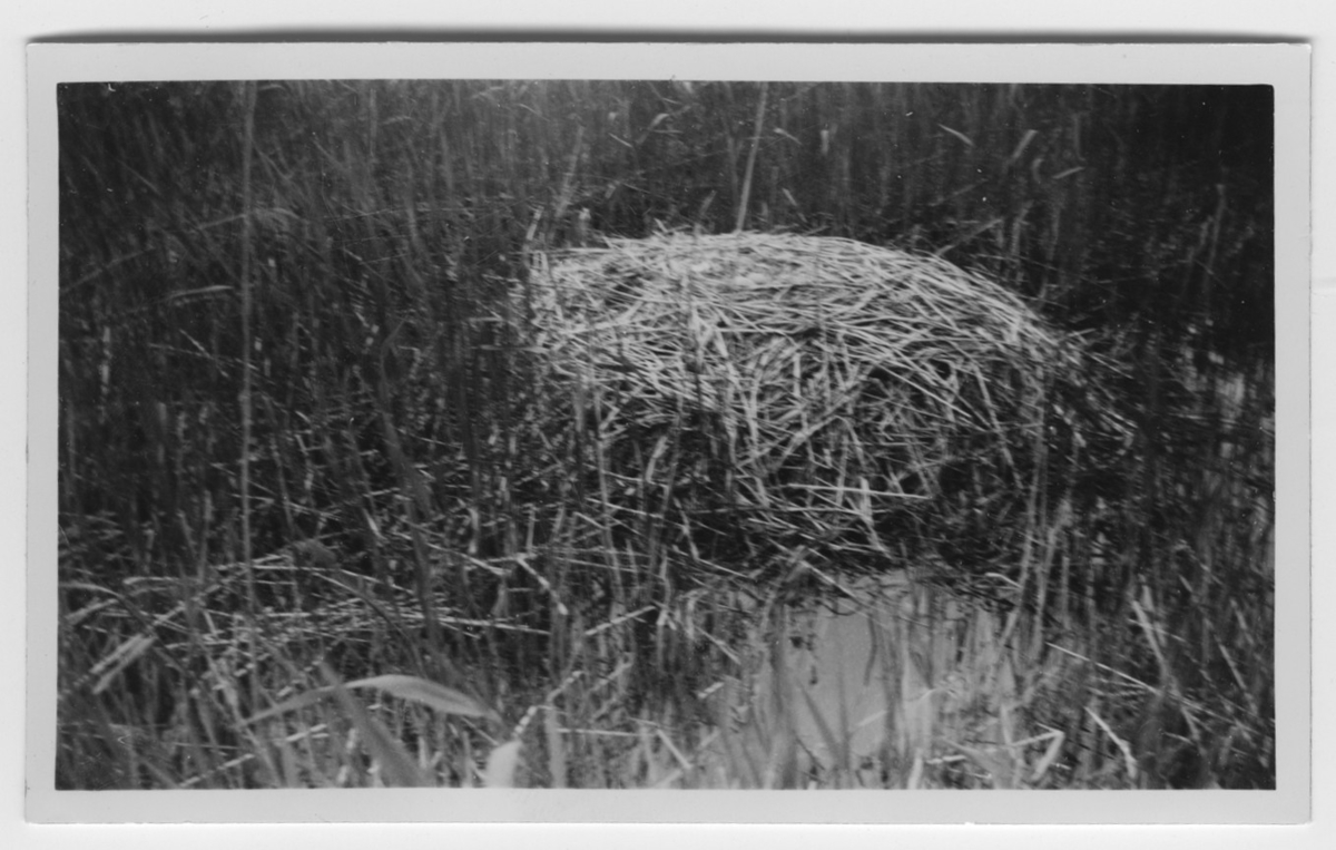 'Bo av knölsvani vassen. :: :: Text på baksidan av fotot: ''Knölsvanens bo med 2 st ägg och 1 st äggskal i sjön Kålungen vid Mellerud.'' :: :: Ingår i serie med fotonr. 4500:1-172.'