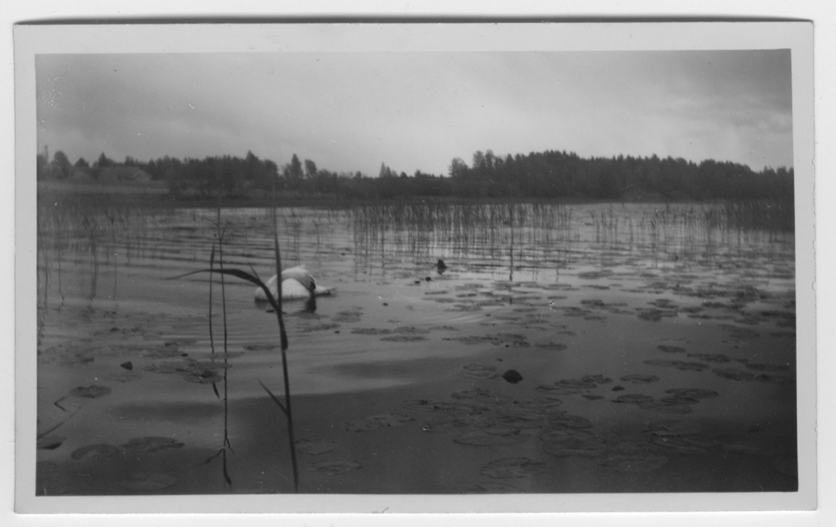 '1 st knölsvan simmande i sjö, omgiven av näckrosblad. :: :: Text på baksidan av fotot: ''Knölsvanhannen gör sig fin för sin maka på sjön.'' :: :: Ingår i serie med fotonr. 4500:1-172.'