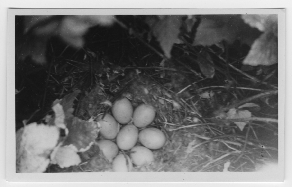 'Bo med 8 st ägg av småskrake. :: :: Text på baksidan av fotot: ''Småskrakens bo med 8 st ägg under ett björnbärsbuskage högst uppe på Östön.'' :: :: Ingår i serie med fotonr. 4500:1-172.'